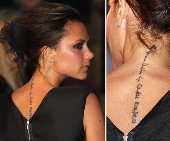 Beckham Victoria Tattoo - Victoria Beckham Is Removing Her Tattoos : Victoria beckham's tattoos have also drawn considerable attention from fans and foes alike, especially her neck tattoo that matches one of david beckham's arm tattoos.. Celebrities have a very big influence, shaping opinions and causing trends: Showing off her cool hebrew script tattoo on back neck along a vertical line over spinal cord. David & victoria beckham romeo gets fake harper tattoo photo. David and victoria beckham, the nicest tattooed couple in the world! Victoria beckham tattoo showing off her cool hebrew script tattoo on back neck along a vertical line over spinal cord.